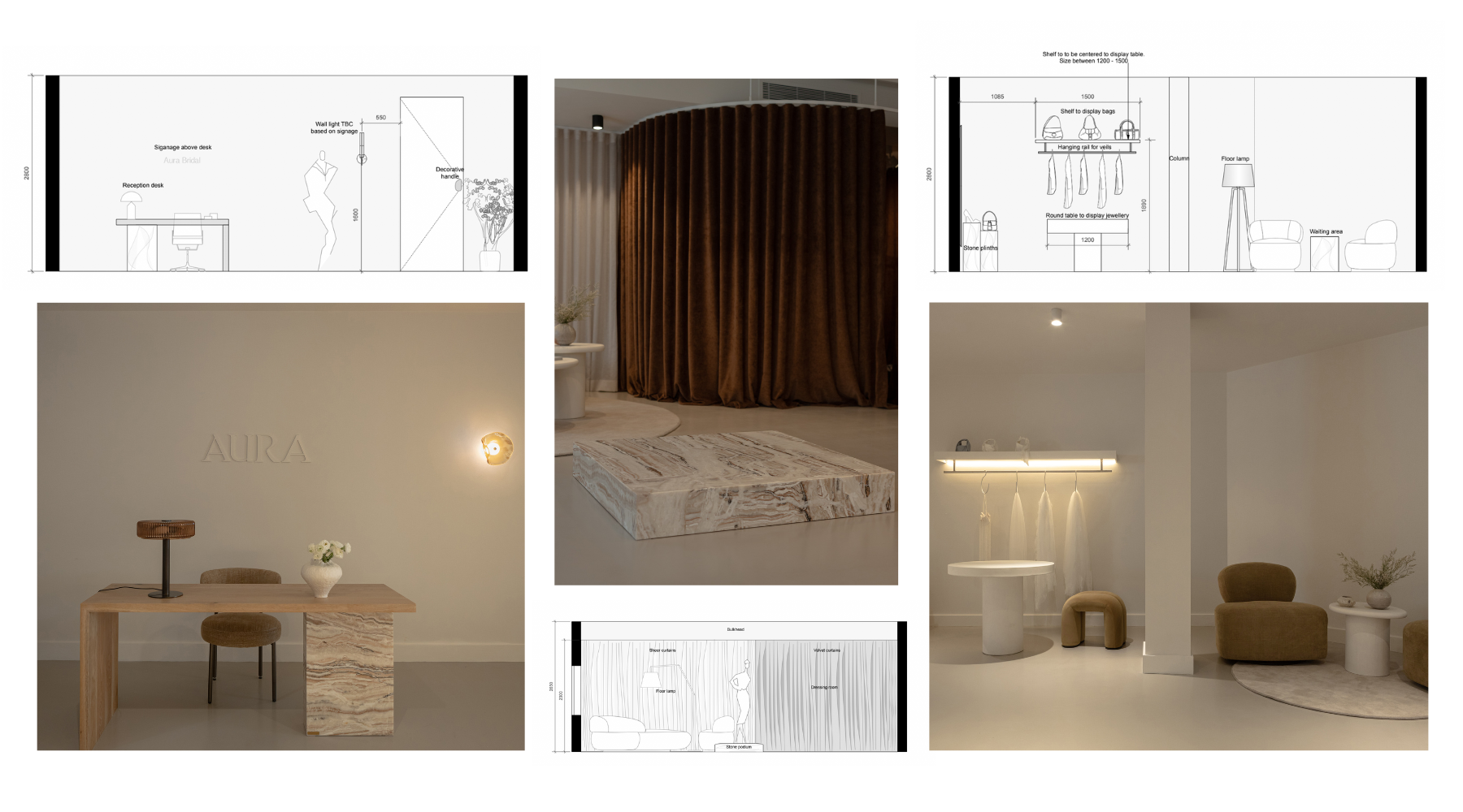 Aura Bridal was envisioned as an intimate, refined boutique that felt emotionally warm while quietly luxurious. From our earliest conversations, the brief centred on the bride and her experience from the moment she walked through the door.