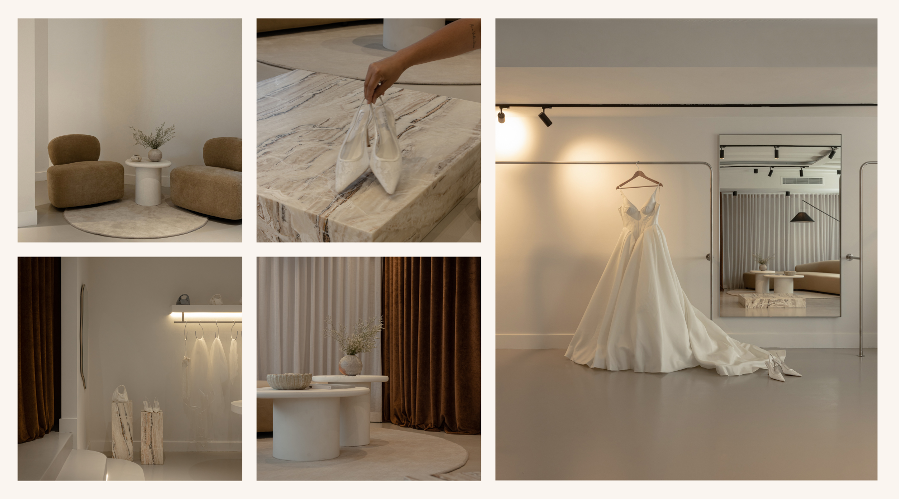 Materials were chosen for their natural, tactile quality and ability to age gracefully. Feature stone elements were paired with custom-designed pieces, creating a balance between structure and softness. The palette remains calm and cohesive, allowing the dresses to remain the hero.