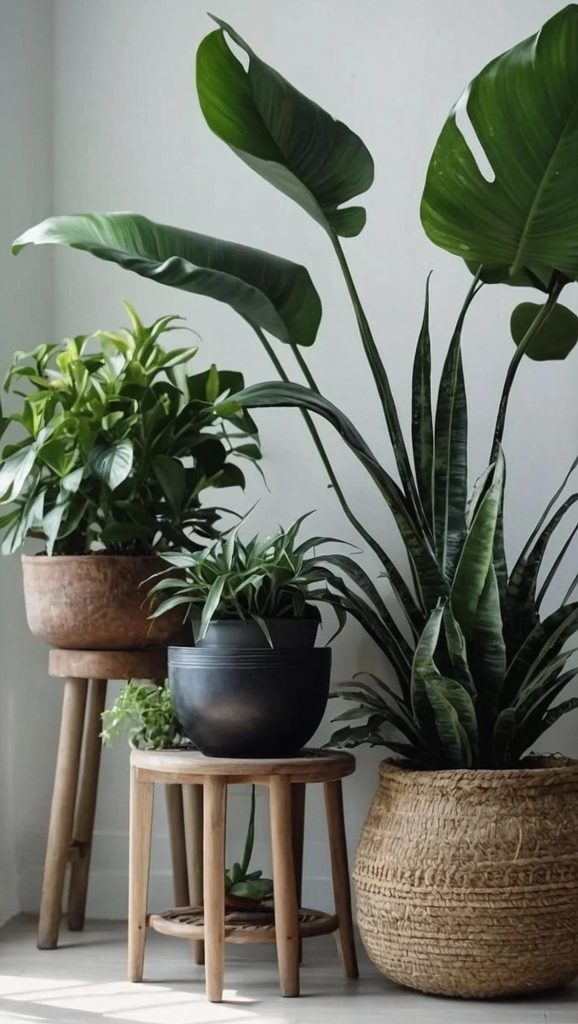 Treat larger plants as focal points in a room. A Fiddle Leaf Fig in a corner or a Monstera near a window can anchor the space and draw the eye. Balance these with smaller plants scattered around shelves, tables, or countertops to create harmony.
