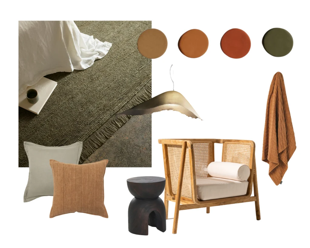 Invite colour and texture into your space through switching up your palette and introducing warmer hues; olive green textured scatter cushions, rust throws and warm linen upholstery.