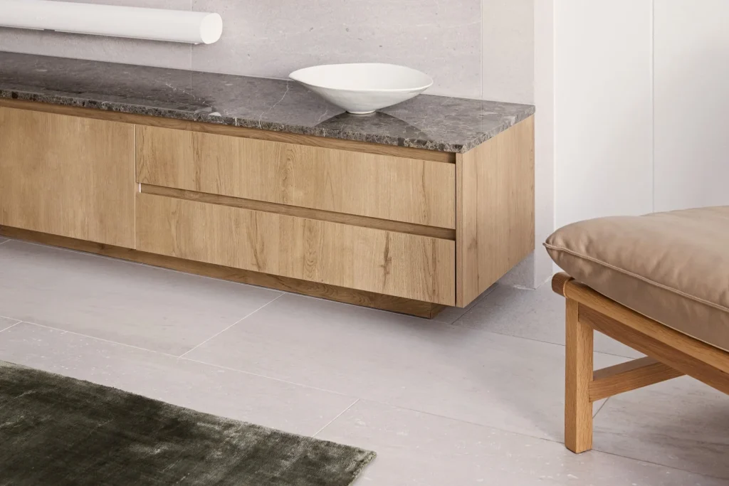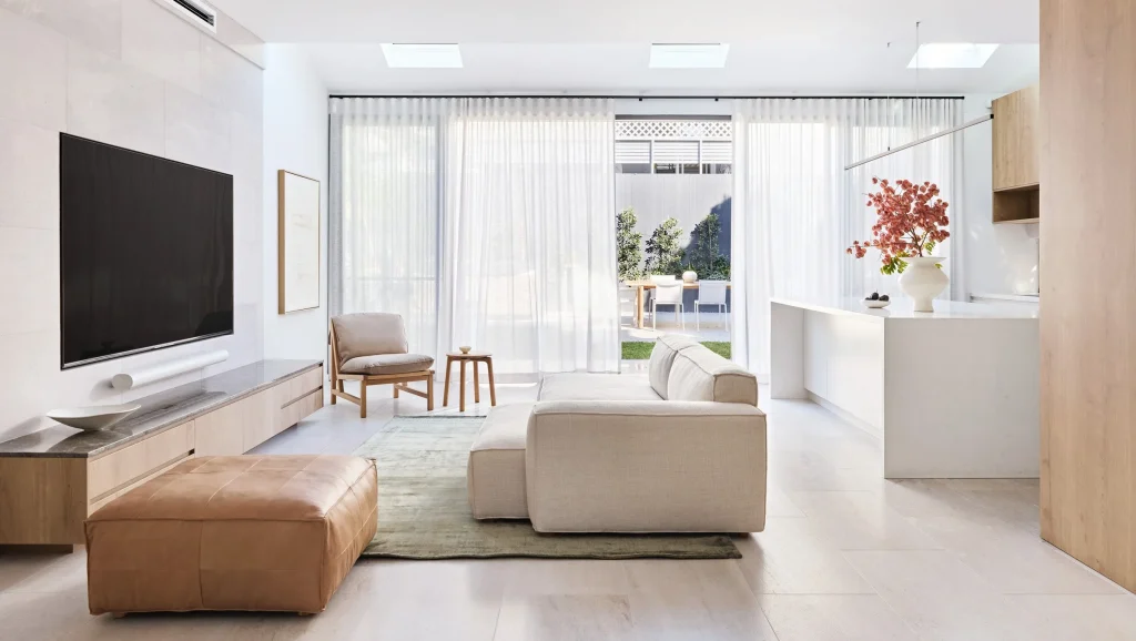 To set the foundation for the interior space, we chose a beautiful grey, marble tile from RMS Marble spanning across the entire living and dining area on the ground floor, to then wrapping the entertainment unit feature wall. The cool undertones of the tile creates a serene and contemporary ambience, and flow from floor to ceiling optimising and elongating the space. This choice was complemented by a meticulously designed, custom built-in entertainment unit that seamlessly blends into the space, providing optimal storage and a functional and visually appealing focal point for the interior.