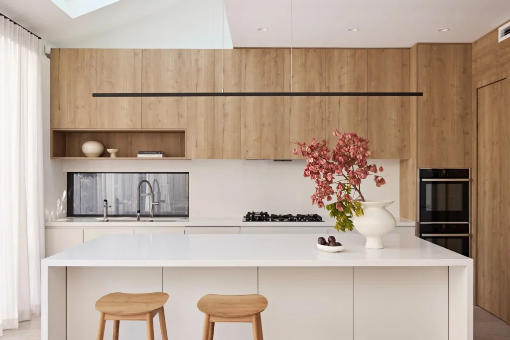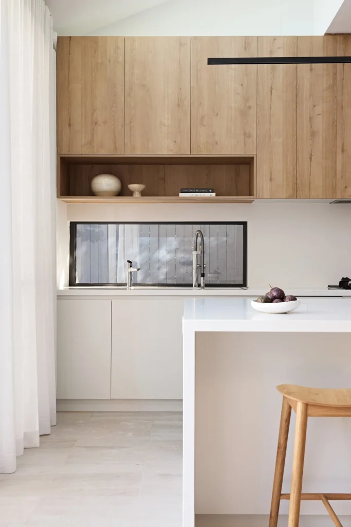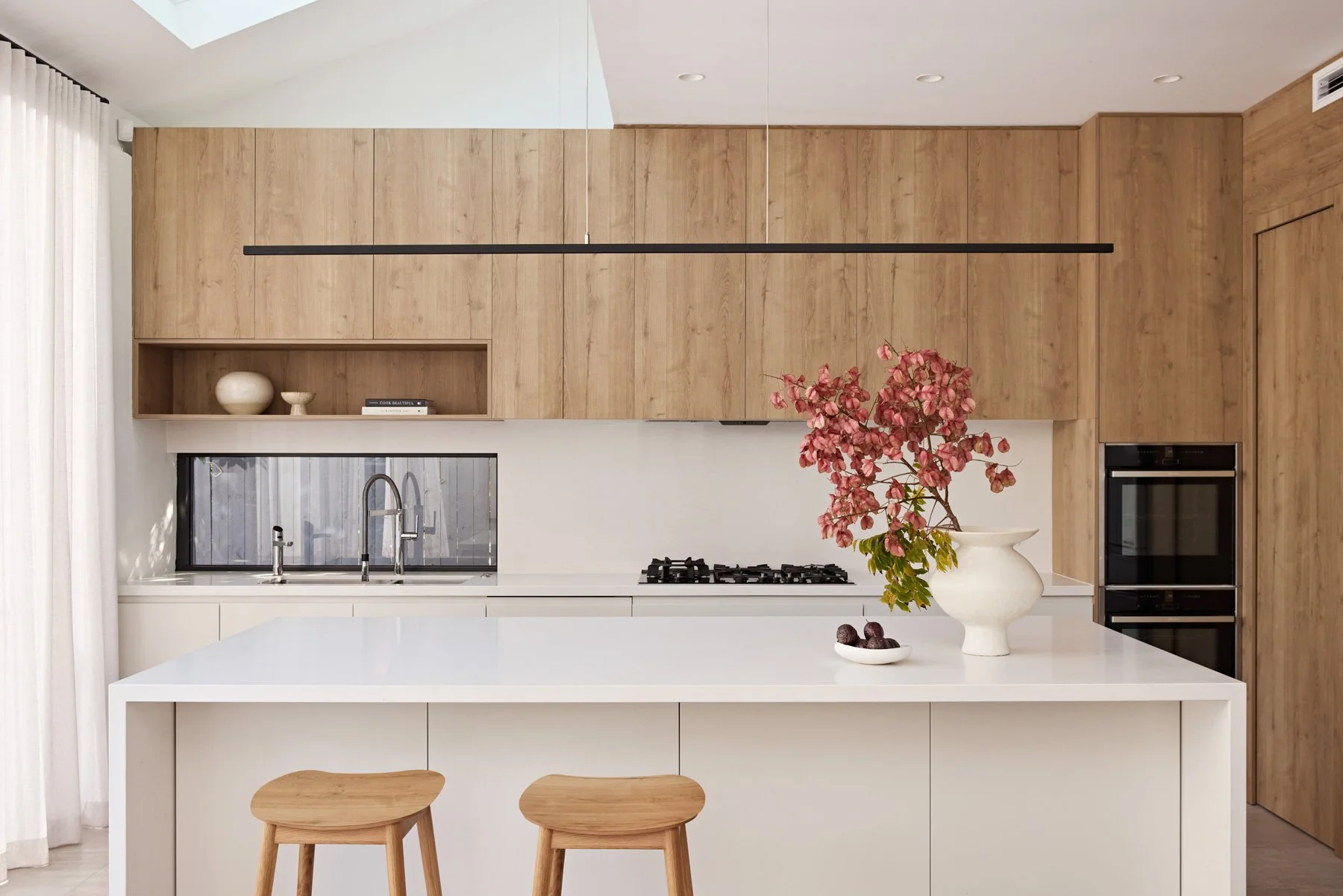 The heart of this home is undoubtedly the kitchen. Here, we aimed to create a spacious haven with a touch of sleekness. The combination of timber and warm white finishes brings a sense of warmth and lightness, perfectly embodying the modern aesthetic, as well as the luxurious appliances by neff. With the installation of a seamless modern pendant light and the island bench, adorned in white, this area of the home provides a spacious and inviting space for gathering and preparing meals. Built by Sky Joinery, hosts a 2.6m Caeserstone island bench, with floor to ceiling flush joinery in Polytec Prime Oak to suit the family of 5. The timber cabinetry adds an organic touch and contributes to the overall visual harmony. The coastal sleek design is enhanced by an abundance of natural light that streams through the glass doors and skylight, creating an airy and open atmosphere.