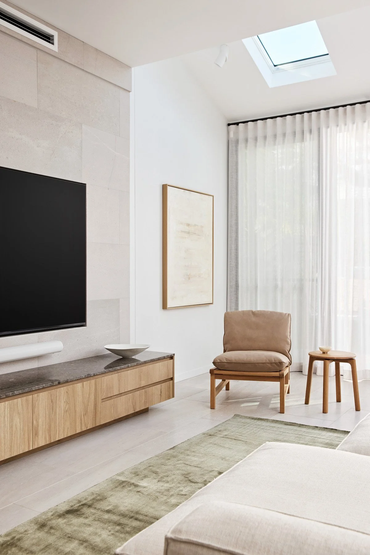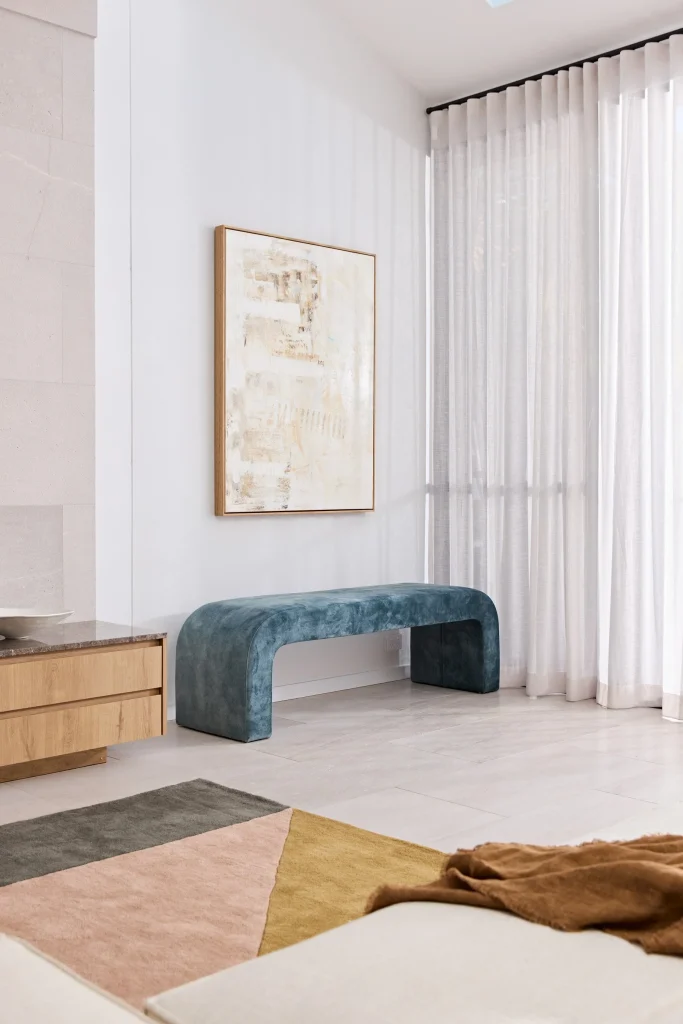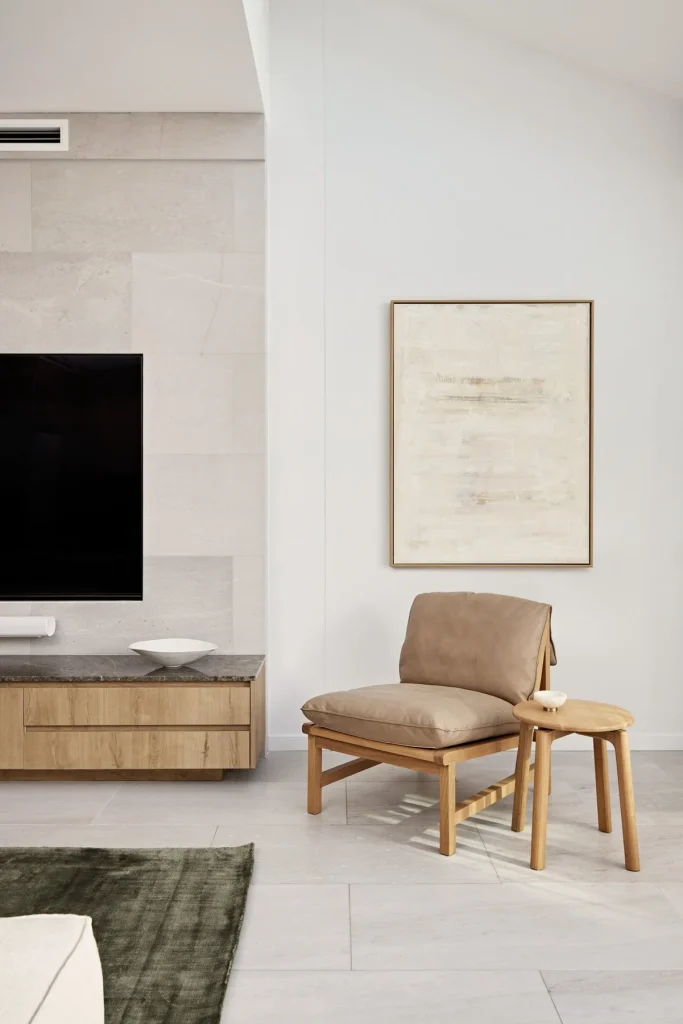 To complete the simplistic modern look, we carefully selected timber furniture pieces that effortlessly blend with the surrounding elements. These pieces not only add a touch of warmth but also create a harmonious connection between the different spaces. The inclusion of hints of green in the rug and leather accents brings a natural and earthy feel, reminiscent of the neighbouring landscape.