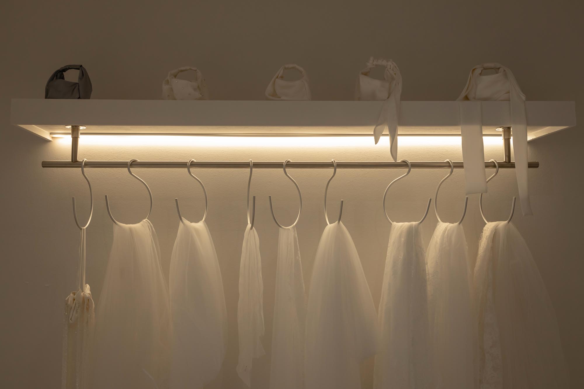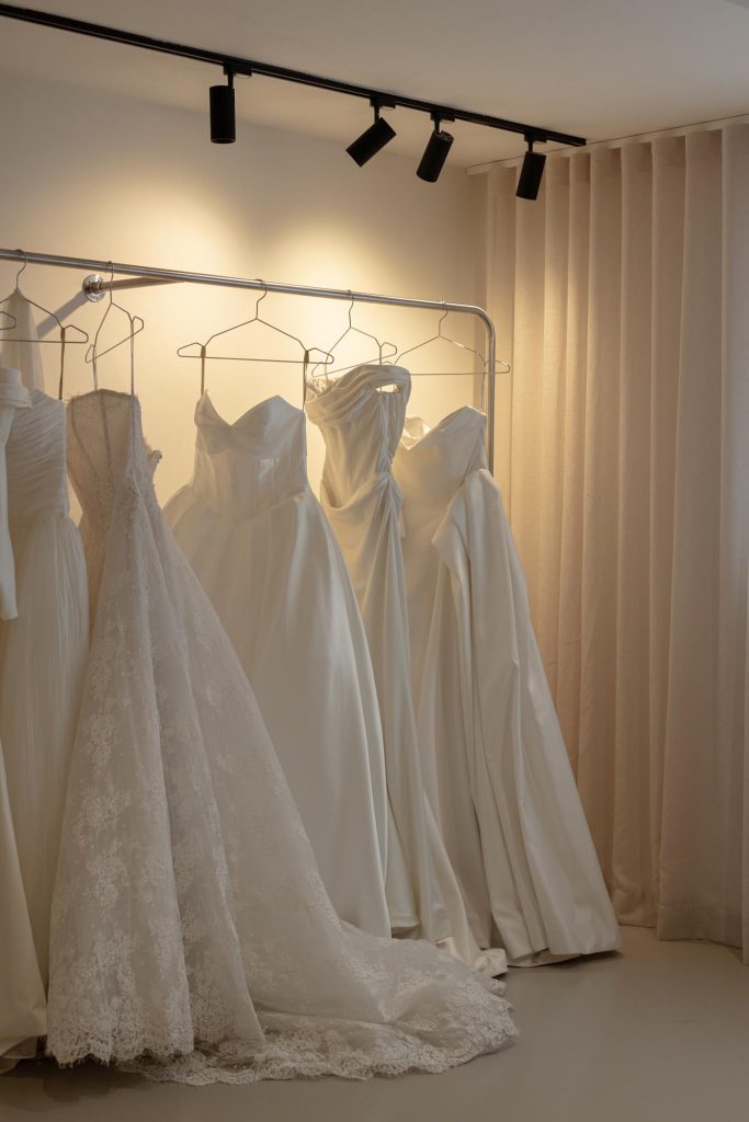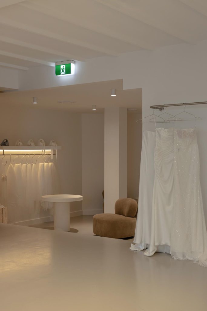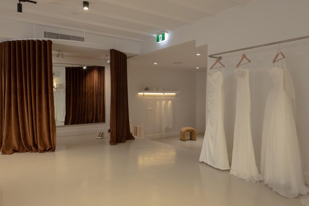 Lighting was carefully considered to flatter both the gowns and the brides wearing them. A layered lighting scheme combines soft ambient light with feature lighting to introduce warmth and intimacy throughout the boutique.