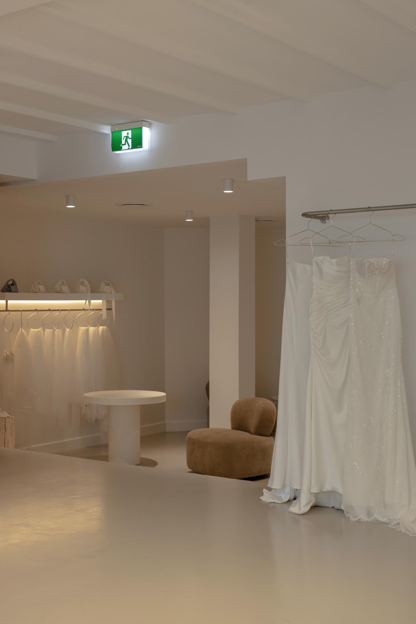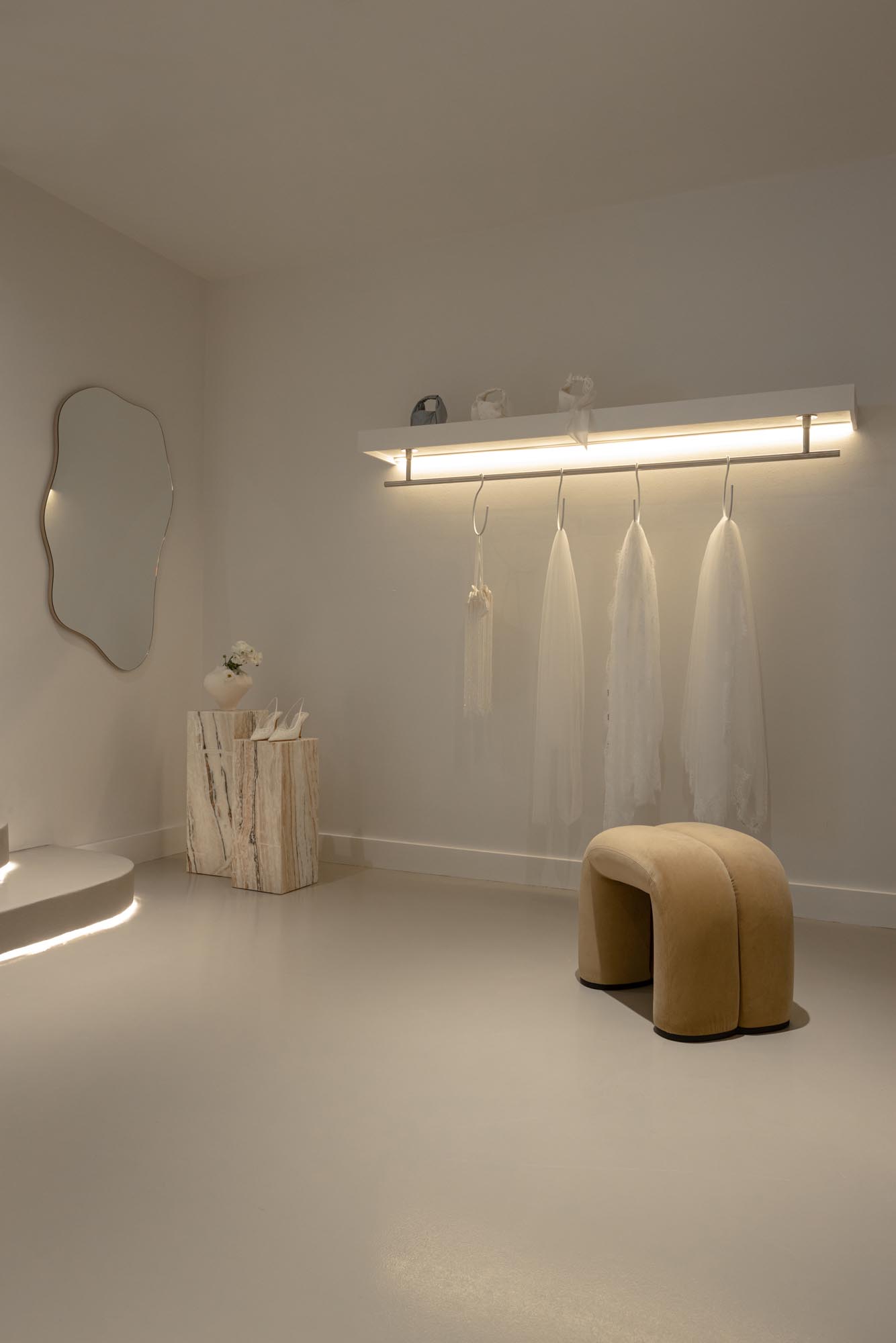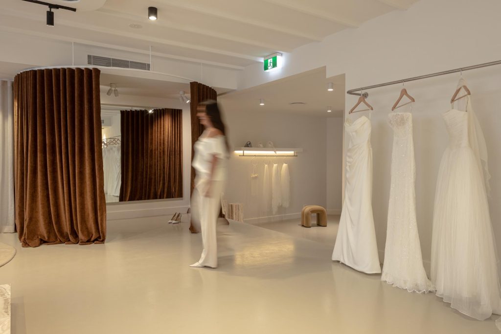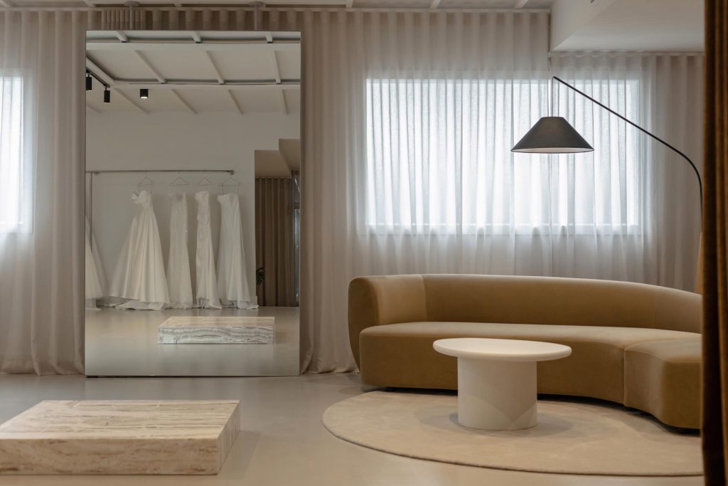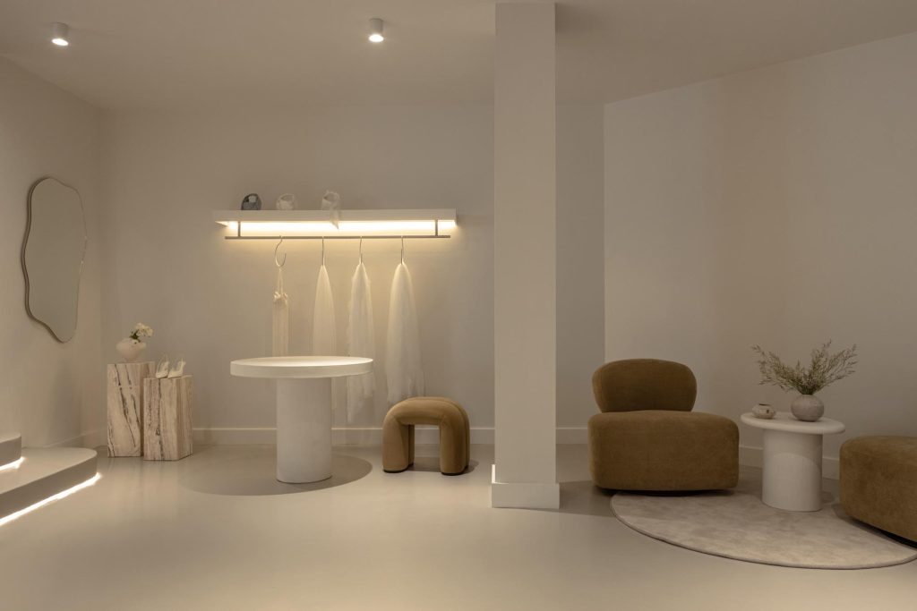 The fitting room was designed as a standout moment within the boutique. Curved forms soften the geometry of the space and create a sense of flow and femininity, while the calm tonal palette allows the dresses to remain the visual focus.