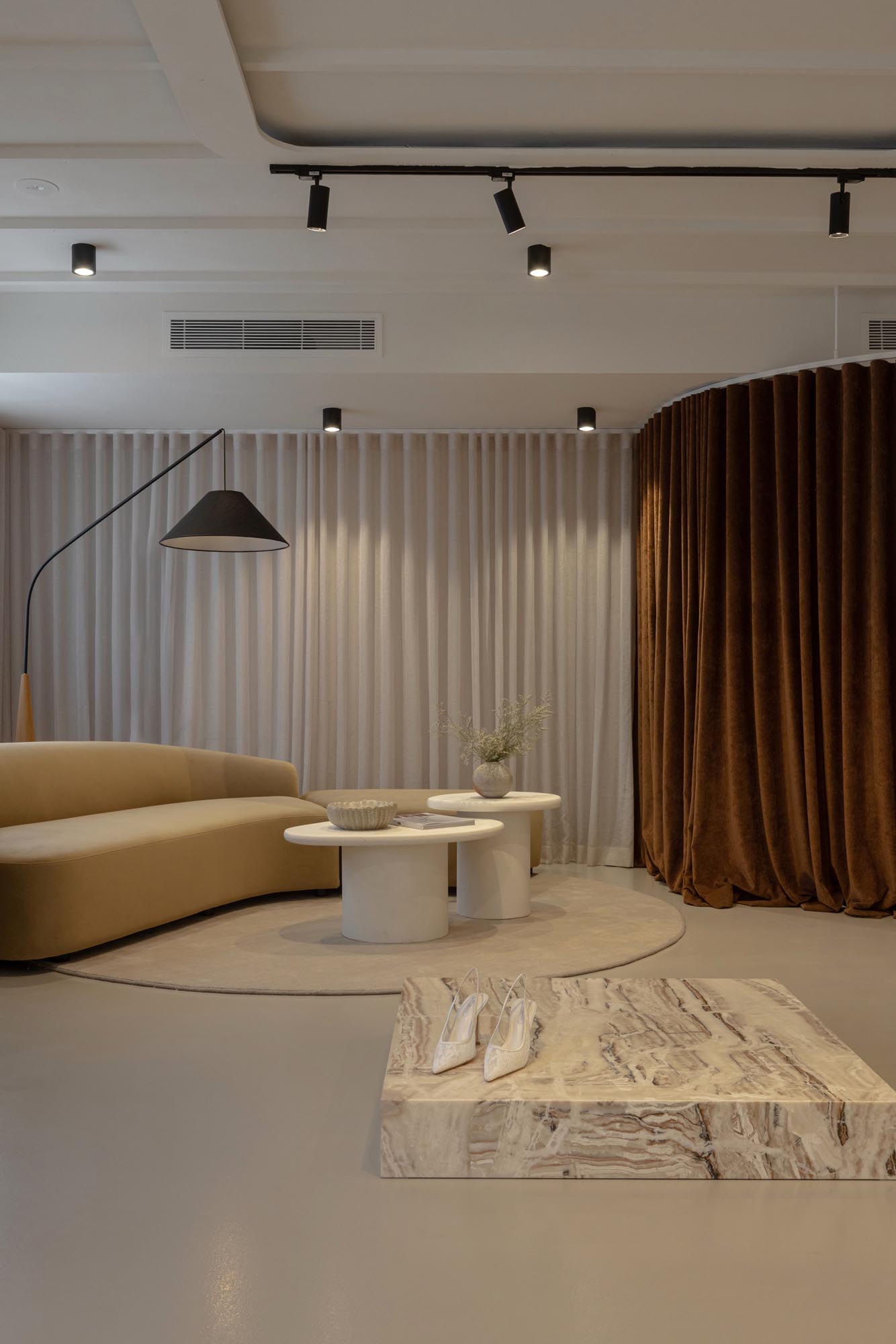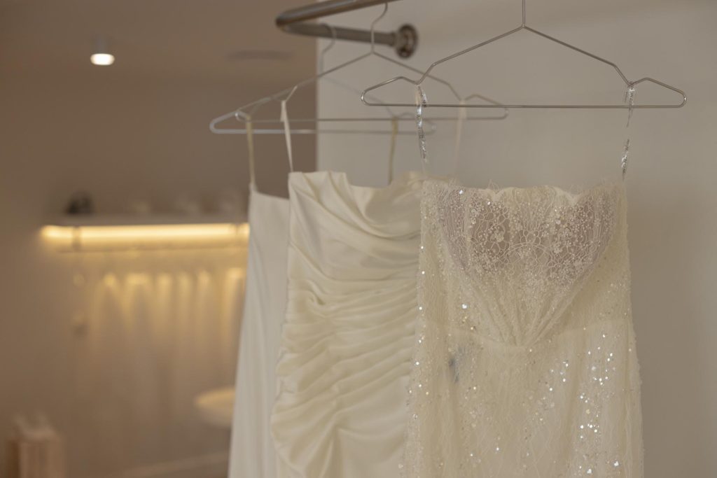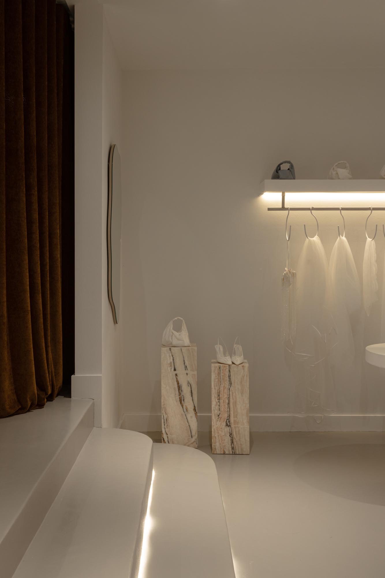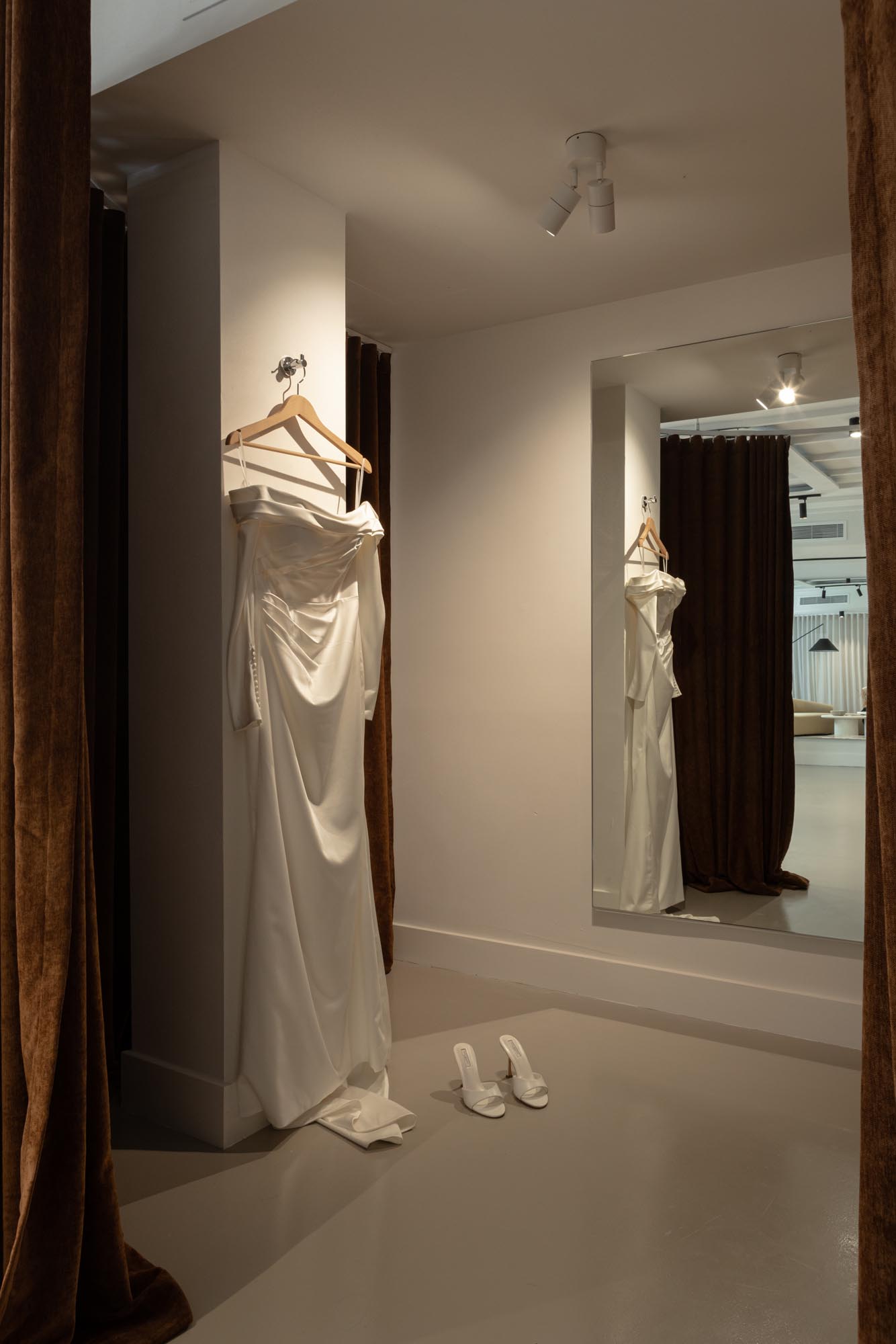 The fitting room was designed as a standout moment within the boutique. Curved forms soften the geometry of the space and create a sense of flow and femininity, while the calm tonal palette allows the dresses to remain the visual focus.