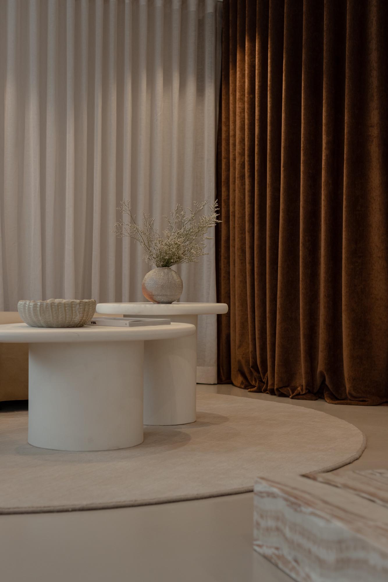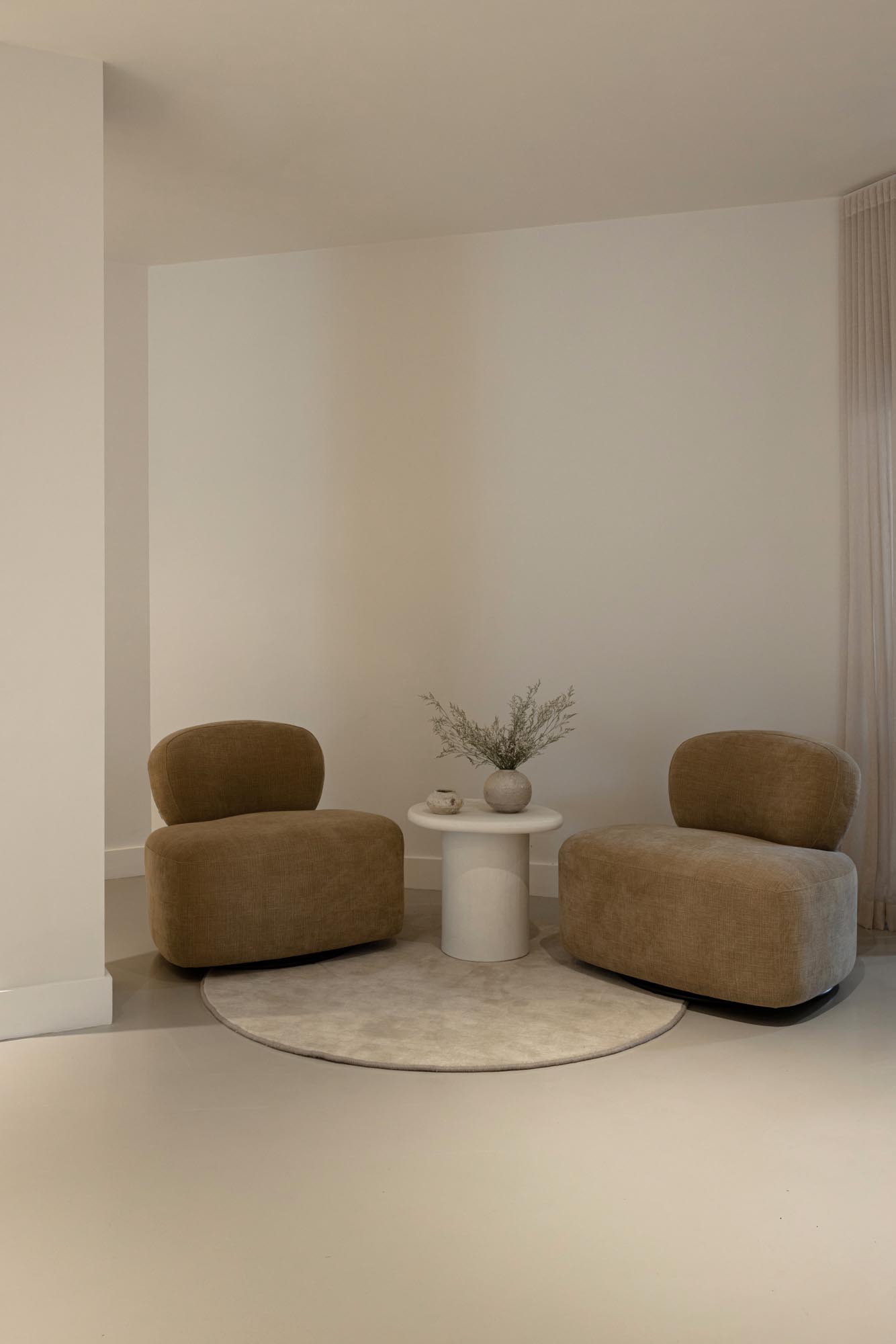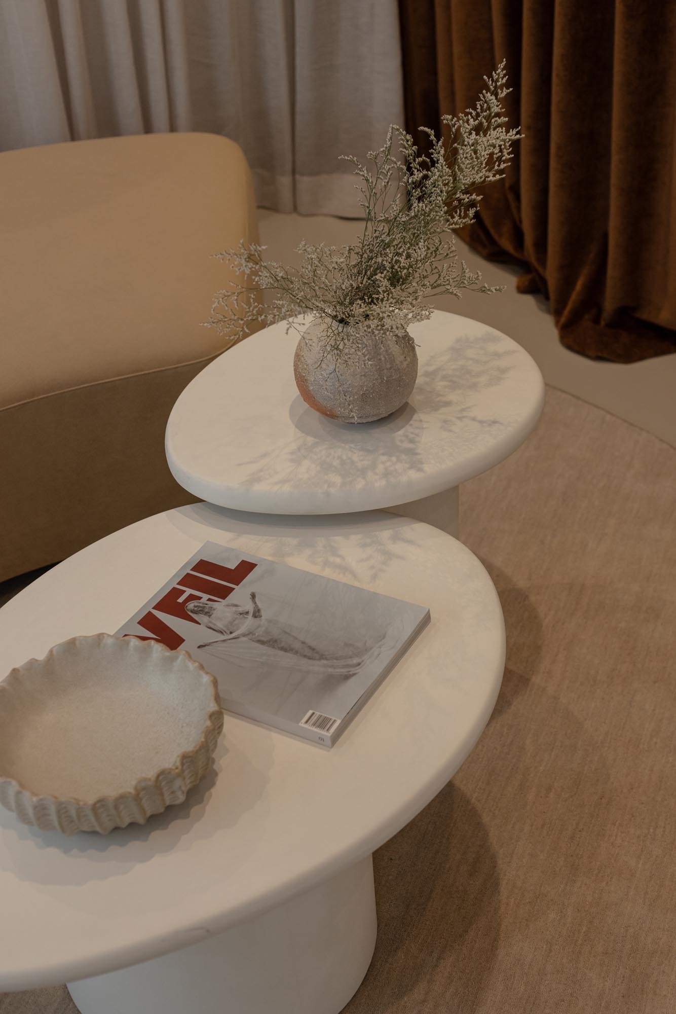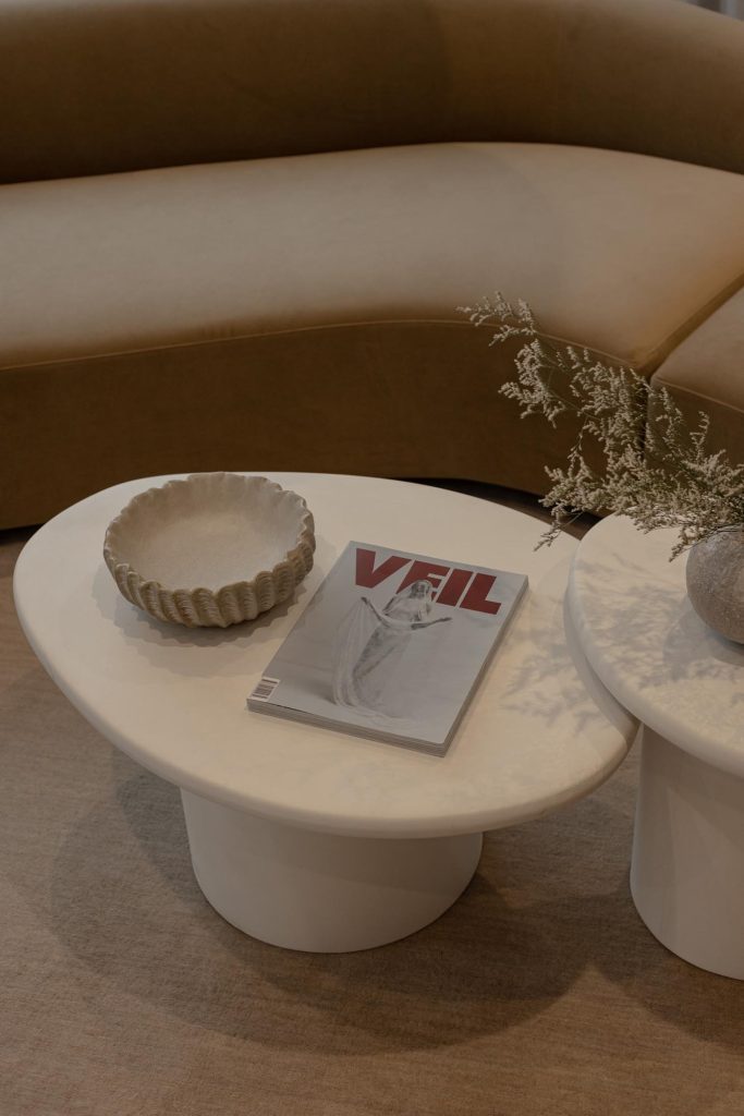 Furniture was selected for comfort and timelessness, supporting the shared experience of fittings where brides are often accompanied by family and friends. Sofas, coffee tables and occasional seating by Horgans provide relaxed gathering spaces, while custom-cut Ecru rugs by Weave Home echo the curved design language of the interior and introduce softness underfoot.