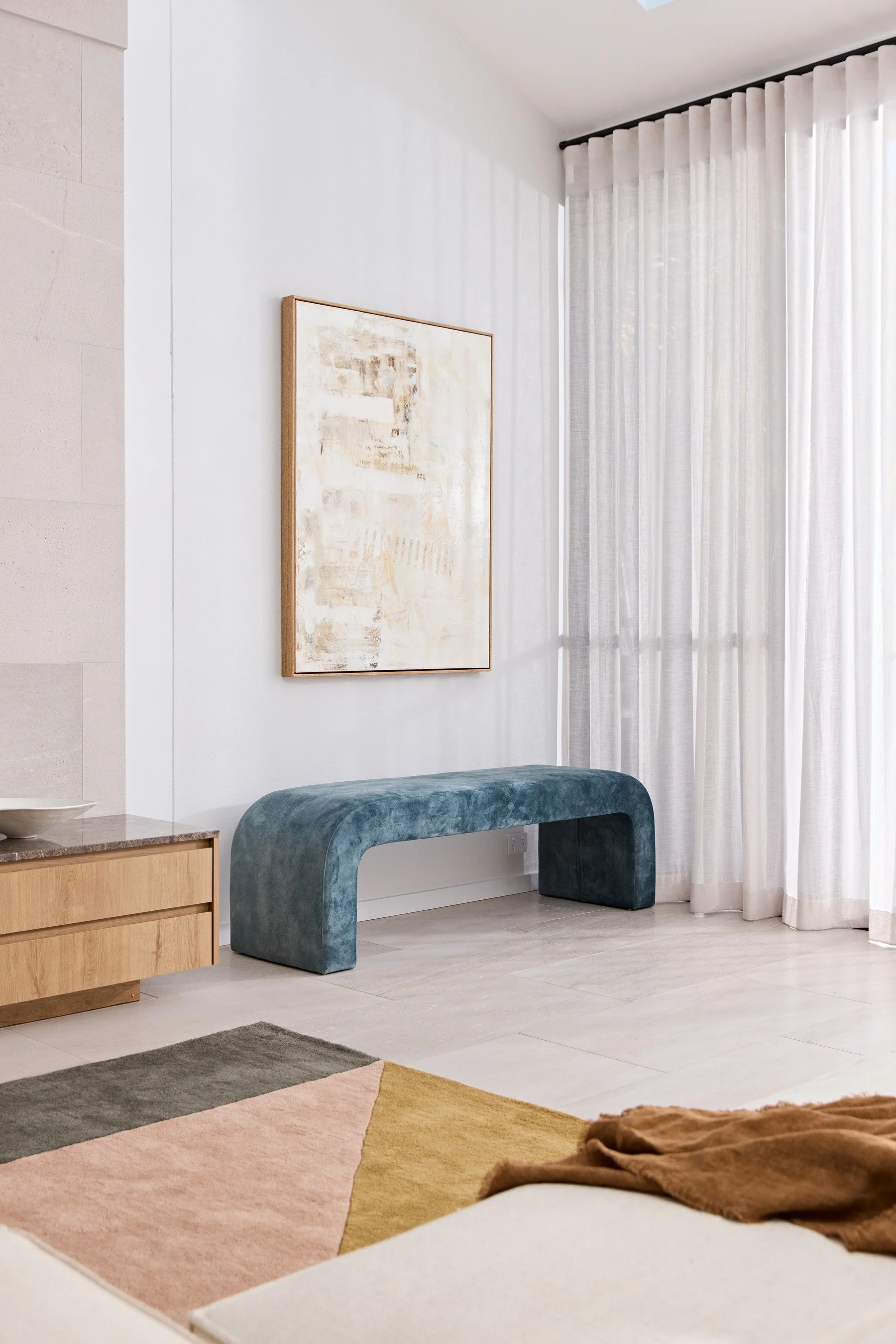 Accessories: Papaya thea bowl, Bar Stools: Life Interiors Lando bar stool, Bench Seat: Life Interiors Stevie bench, Artwork: Serena Elle Art serena elle art, Rug: Rugs for good LINIE ARGUTO RUG